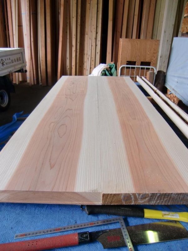 約4Mの耳付き杉板を半分に切り、つなぎ合わせて1枚の天板にします。
