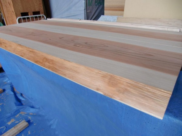 長さをカットし、2枚を並べました。 この2枚をつなぎ合わせる事で、約850mm幅の天板となります。
